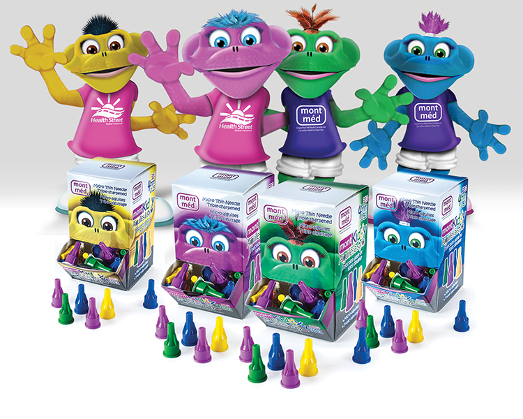 Девиз создателей цветных одноразовых игл для шприц-ручек MontKiddy звучит так: «Впустите цвет в свою жизнь». Компания производит универсальные, совместимые со всеми имеющимися на рынке шприц-ручками иглы длиной 4 мм калибра 32 G. В каждой коробке находится 100 иголок 4 цветов. По словам производителя разноцветные иглы позволяют: